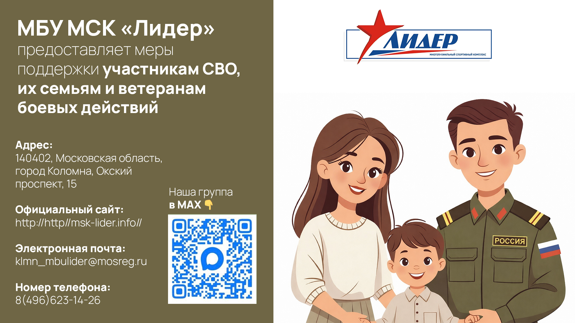 Муниципальное бюджетное учреждение «Многопрофильный спортивный комплекс «Лидер»» информирует о том, что в целях поддержки участников СВО, их семей и ветеранов боевых действий предоставляет доступные условия для занятий в спортивных секциях на безвозмездной основе.